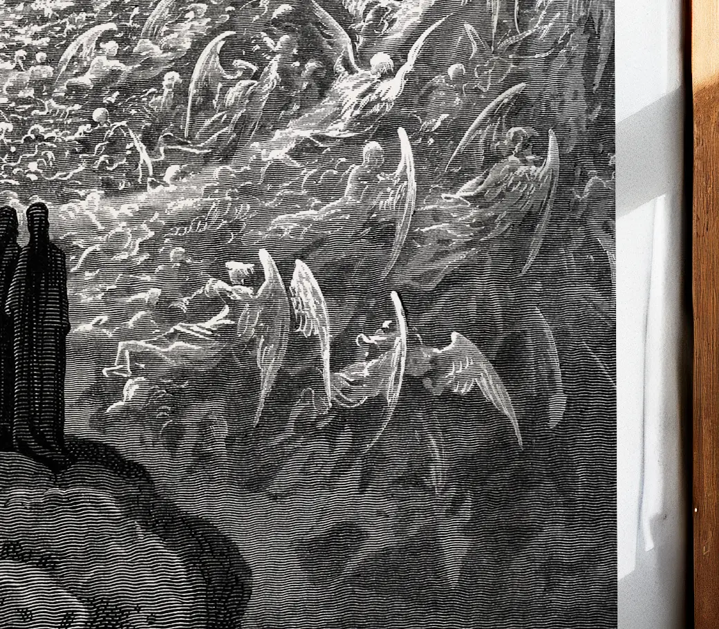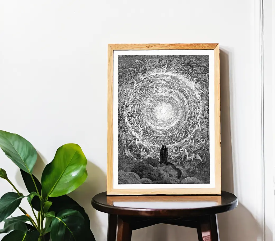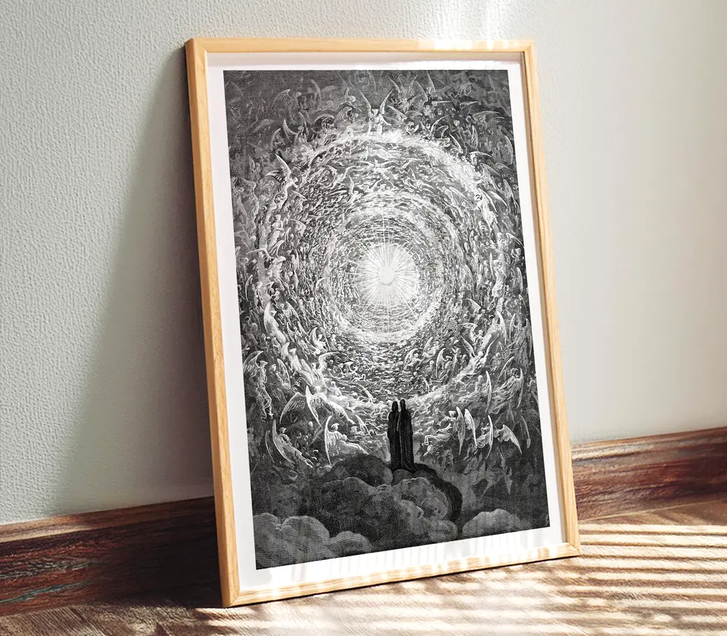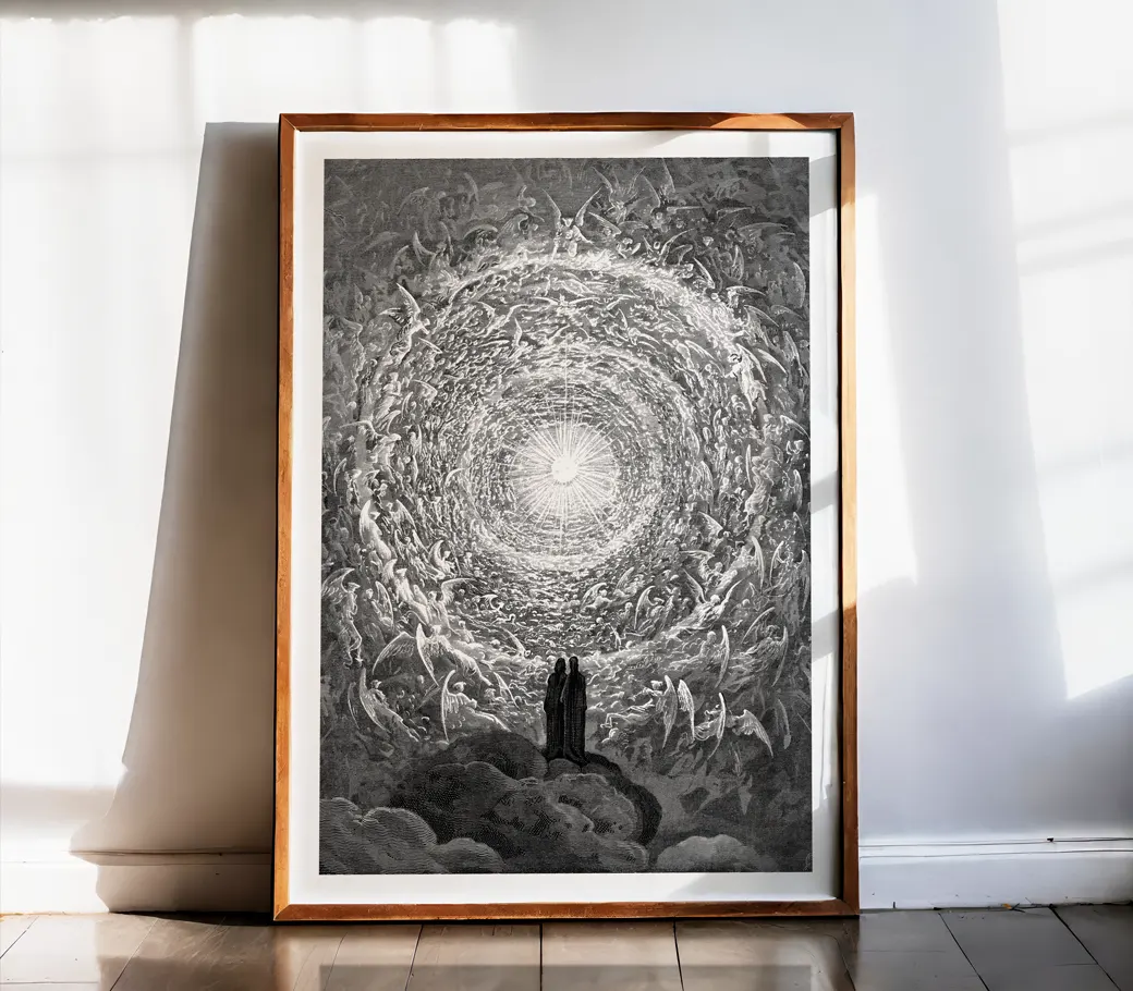 Dans ce dernier chant, L’Empyrée, Doré capture la vision de la lumière éternelle : un espace infini où les âmes forment la rose céleste, symbole de pureté et de perfection.