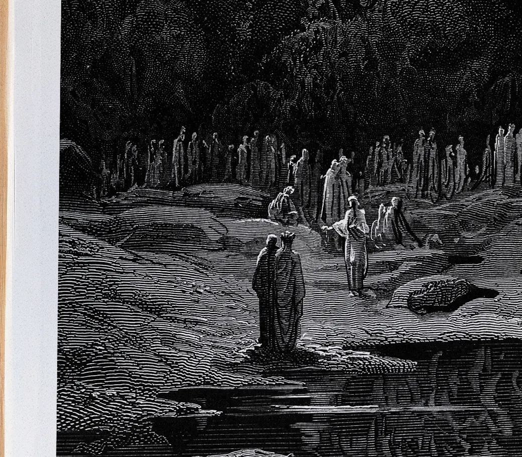 La scène montre les âmes des repentis tardifs, ceux qui n’ont cherché la lumière qu’au seuil de leur dernier souffle. Doré en traduit la gravité et la douceur : silhouettes éthérées, clair-obscur imprégné de mysticisme, atmosphère suspendue entre regret et rédemption.
