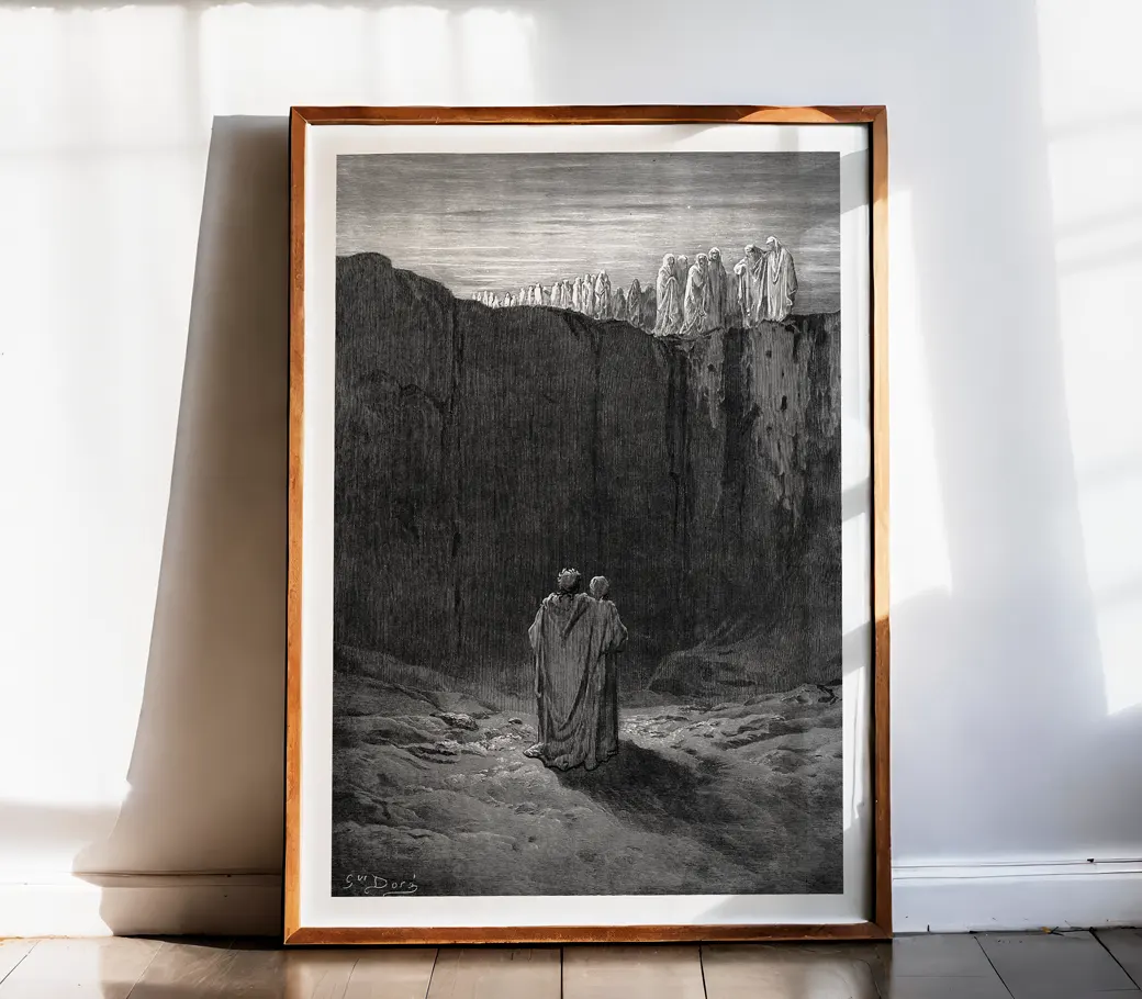 La scène montre les âmes des pénitents rassemblées sur les falaises abruptes du Purgatoire, tournées vers l’ascension spirituelle qui les attend. Doré y déploie une lumière délicate, presque sacrée, qui enveloppe ces silhouettes en marche vers la rédemption. Entre brume, roc et clair-obscur mystique, l’image exprime toute la force du repentir et de l’espérance.