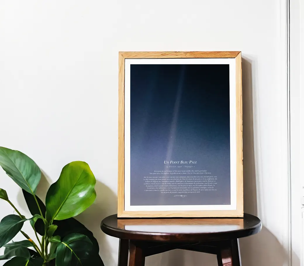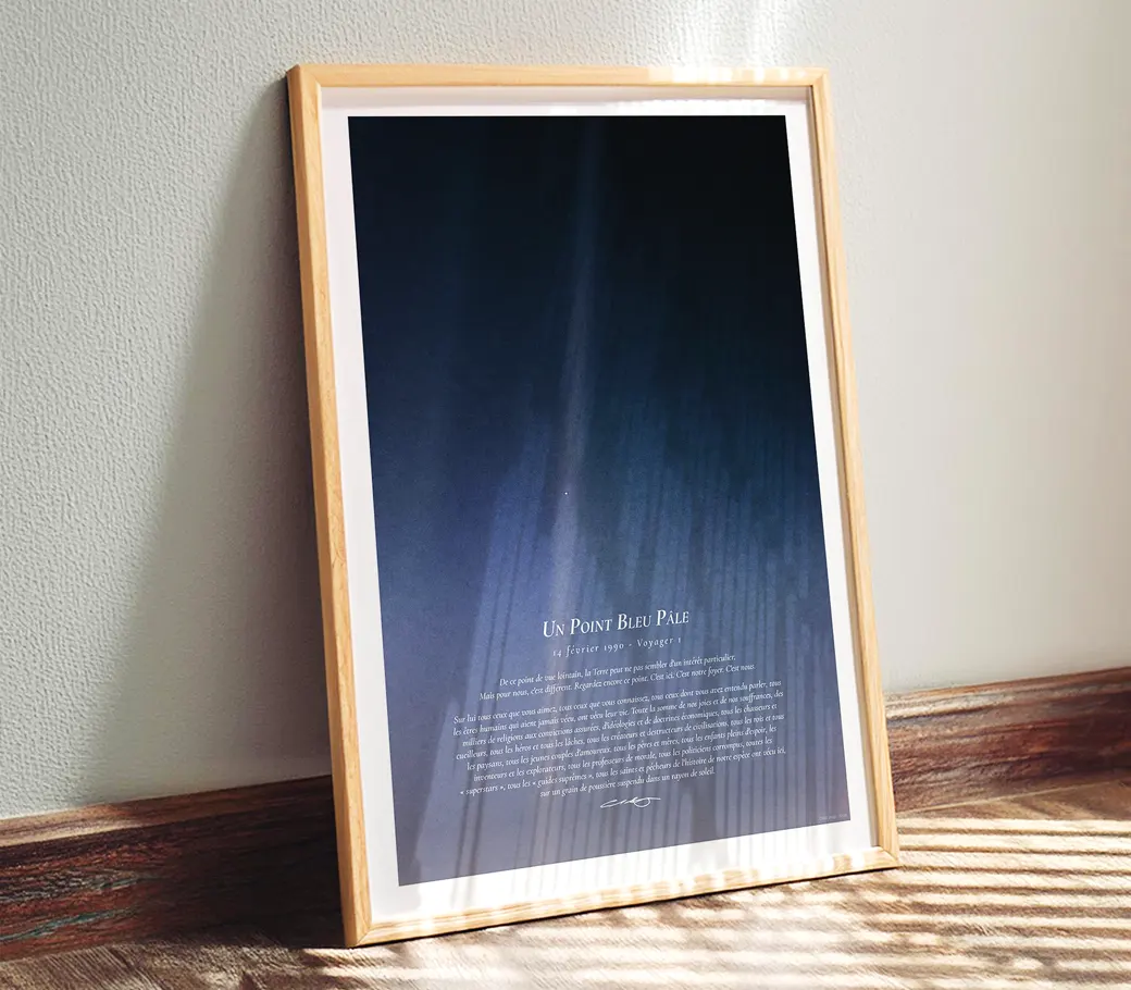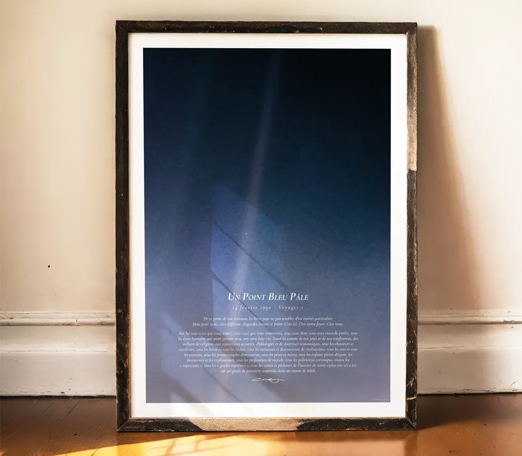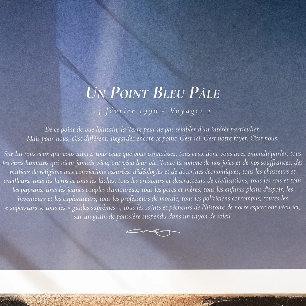 Accompagnée de la citation emblématique de Carl Sagan, cette affiche rappelle la fragilité et la beauté de notre monde, suspendu dans un rayon de lumière.