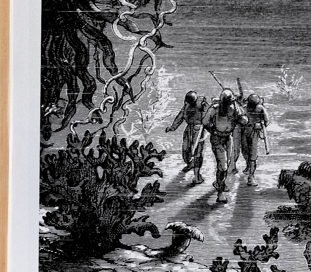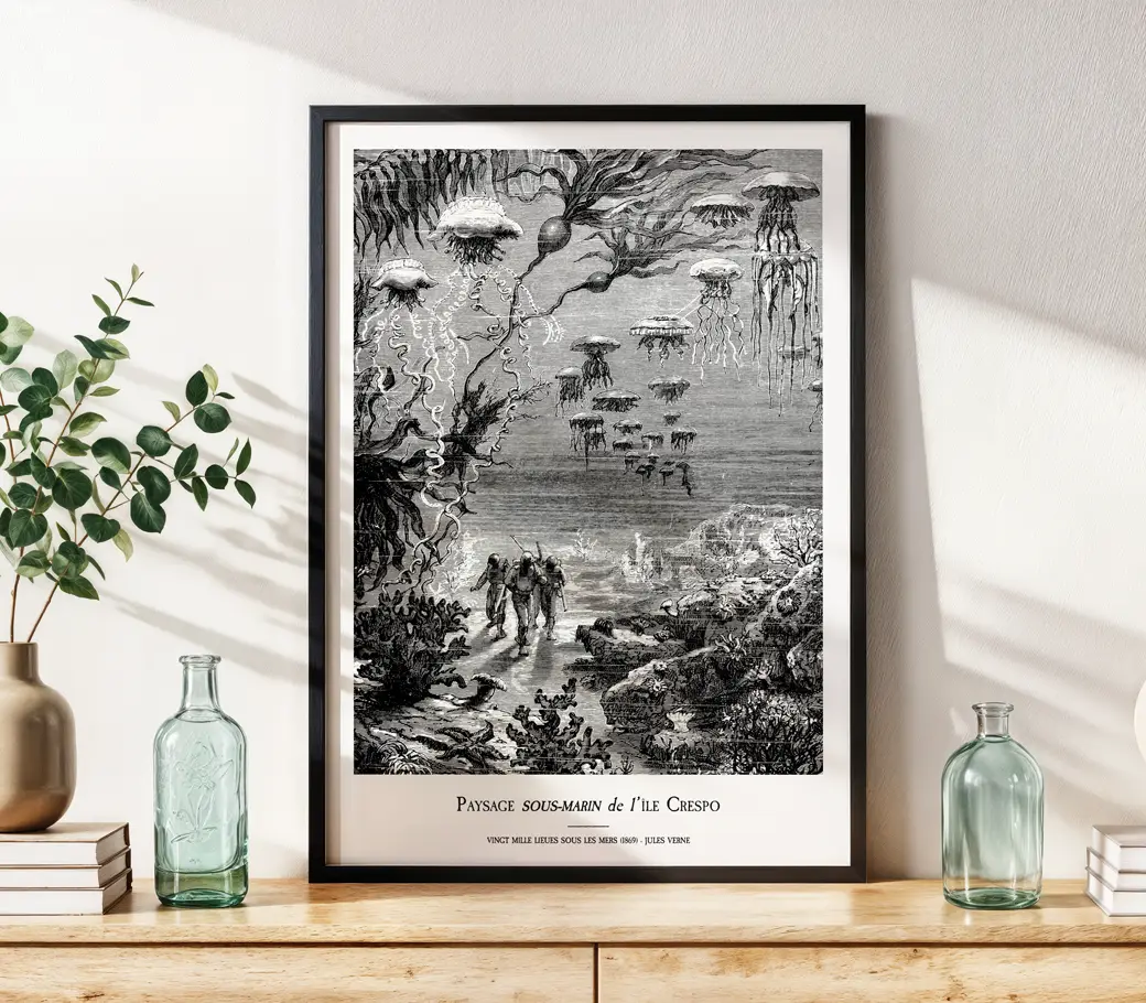 Entre observation scientifique et poésie visuelle, cette œuvre capture toute la splendeur onirique et la mystique de l’exploration océanique chère à Jules Verne.